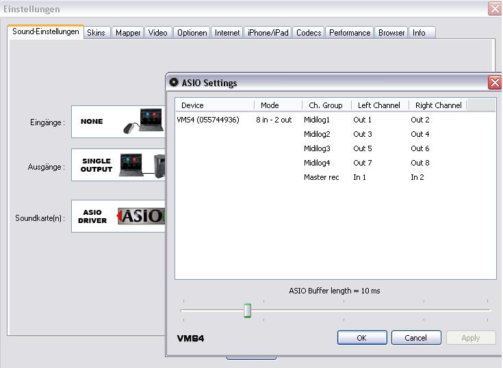 Wenn ich die Einstellungen so unter ASIO vornehme, verschiebe ich den "Master" einfach nur auf CH2 bzw. MIDILOG3 auf dem VMS