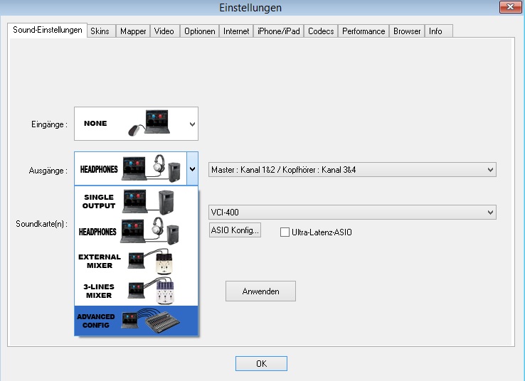 In die Advanced Config kommst Du, wenn Du in den Soundeinstellungen bei Ausgang auf Advanced Config, anstatt auf Single Output stellst.