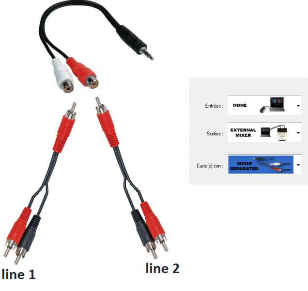 Il faut DEUX câbles, une par sortie distinctes. Si vous regardez l'image à droite, vous remarquerez OUT 1 et OUT 2 donc deux sorties !!!