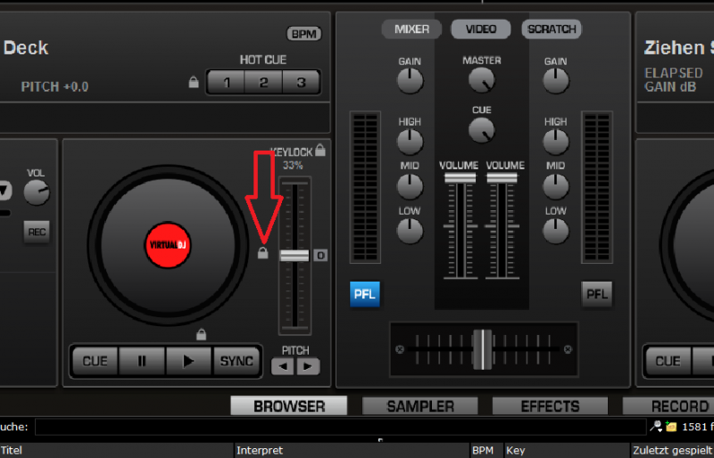 Nein, interessant ist allerdings, das man ich den Pitchfader im VDJ verschiebe, die BPM-Anzeige sich ändert.