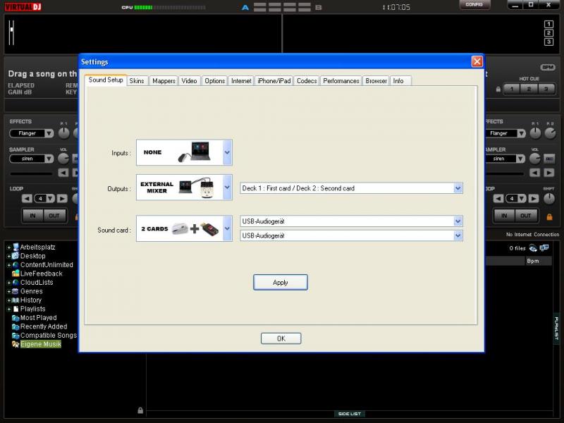 Ich habe VDJ 7.4.7 Pro Basic ( b508) auf meinem Laptop. Benutze die ESI U46DJ als Soundkarte und ein 3 fach Mixer von Omnictronic. Soweit funktioniert alles außer meinen Kopfhörern. Meine Config ist: Input: None , Outputs: Externer Mixer , Deck 1 Kanal 1+2, Deck 2 Kanal 3+4, Sound Card : U46DJ