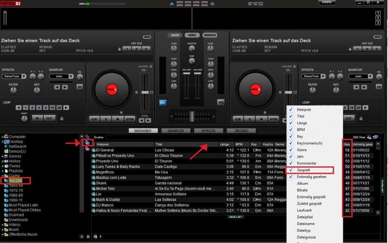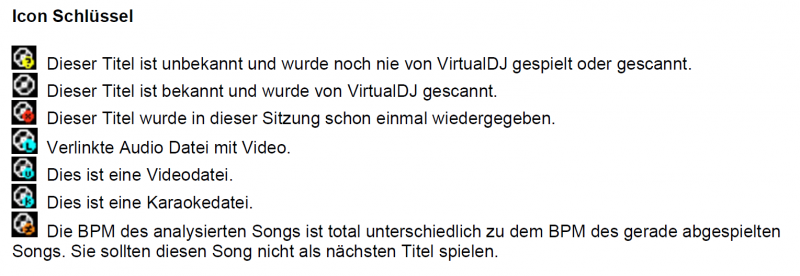 Alle Titel die irgendwann schon mal gespielt worden sind (und somit VDJ bekannt sind) haben ein Lautsprecher-Symbol und alle die noch nie gespielt worden sind haben ein Fragezeichen-Symbol.
