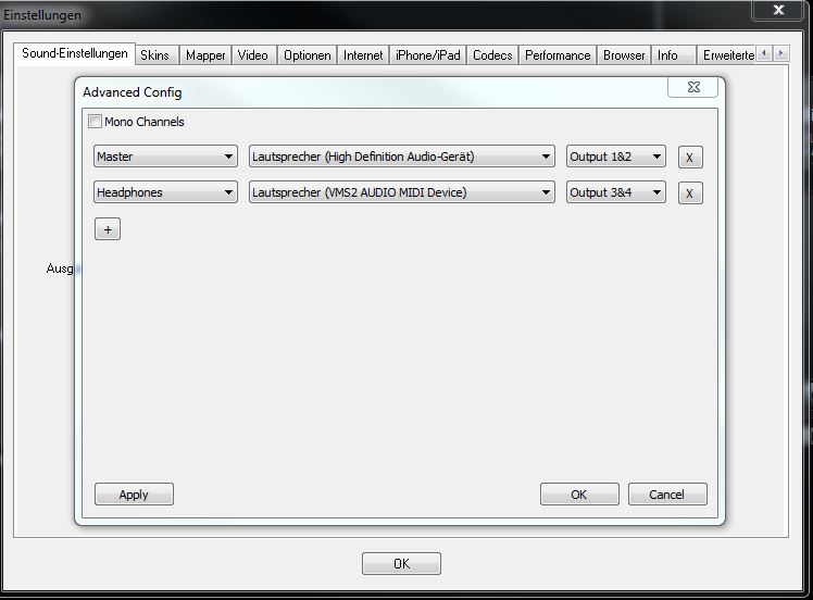 Wenn nicht, dann stelle mal in der "normalen" Soundconfig auf 2 Soundcards. Ausgang auf Boxen und Headphones.