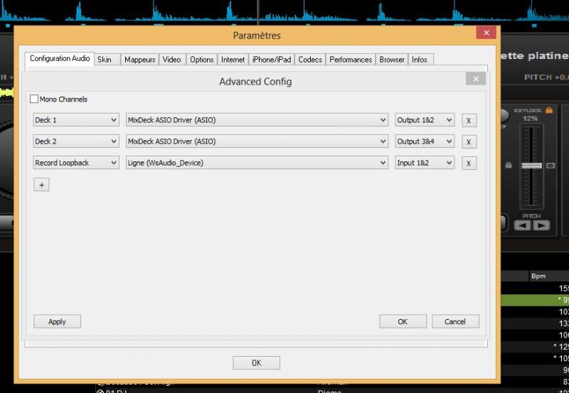 Voici maintenant la configuration que recommande virtualdj pour ce type de soucis , cela fonctionne mais le son est tres tres mauvais , et ce qui est bizard c\'est qu\'il est mauvais aussi en pre écoute sur la numark ( sur le pc et sur la table de mixage ) , je n\'arrive pas trop à comprendre le pourquoi et comment faire ?