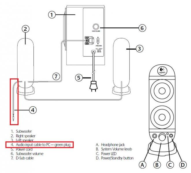 Den Line-In Eingang (Klinkenstecker) ist an einem Satellite Lautsprecher und nicht am Subwoofer. Was an diesem Stecker angeschlossen wird sind die 2 Satellite Lautsprecher. Schau dir mal deine Lautsprecher genauer an. Eventuell musst du ein Verlängerungskabel kaufen mit Minijack 3.5 Buchse auf Minijack 3.5 Stecker oder Minijack 3.5 Buchse auf 2 x Cinch (L-R).