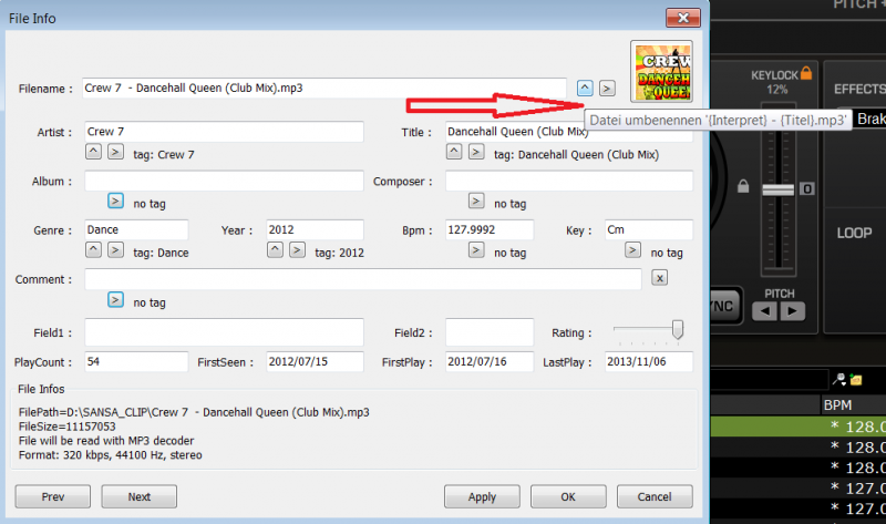 Nach den Änderungen auf die "Pfeilkästchen" am entsprechenden Feld klicken ( Wert in der ID3 Tag schreiben) danach auf "Apply" und auf OK