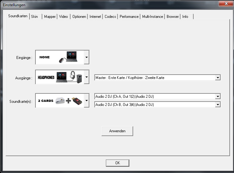 Dann jeweils abwechselnd mit AutoKopfhörer immer auf 3-4 das andere Deck auf dem Kopfhörer. Kopfhörer muss auf der Soundcard eingesteckt werden auf 3-4. Die Samplers laufen immer über den Master.
