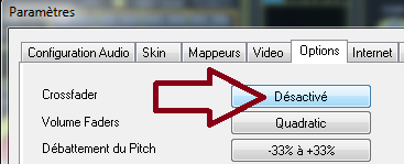 Dans settings ou configuration de Virtual DJ, cliquer sur options, puis désactiver crossfader en cliquant sur le pavé au regard de Crossfader.