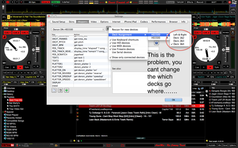 Back on the mapper tab, click on the square 'mappers options' button and you should see a menu choice called 'deck assign', which tells VDJ which on-screen deck you want your 5500s to control. Set one 5500 to control decks 1&2 and the other to control 3&4.