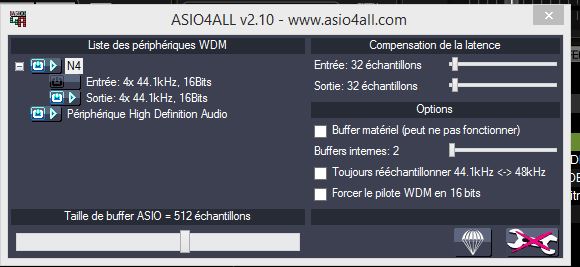 Je viens de mettre à jour le driver de la carte son, j\'obtiens ça dans le driver Asio : output, input;;;
