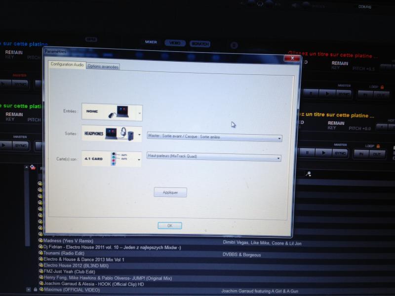 bonjours, voila dans config audio je règle en sortie single output et je mais ma carte son de la table de mixage (numark mixtrack quad) ensuite appliquer et ok. je retourne dans config audio et sa a remis comme avant mais réglage ne se font pas.