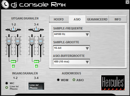 - Lance le programme, et sélection Hercules DJ Rmx ASIO sous Select ASIO Driver , et Output 3/4 (le casque) pour Select Device Ouput
