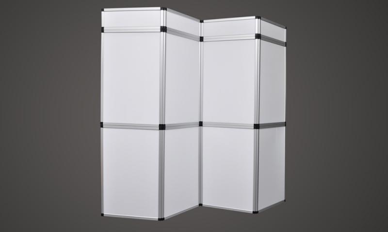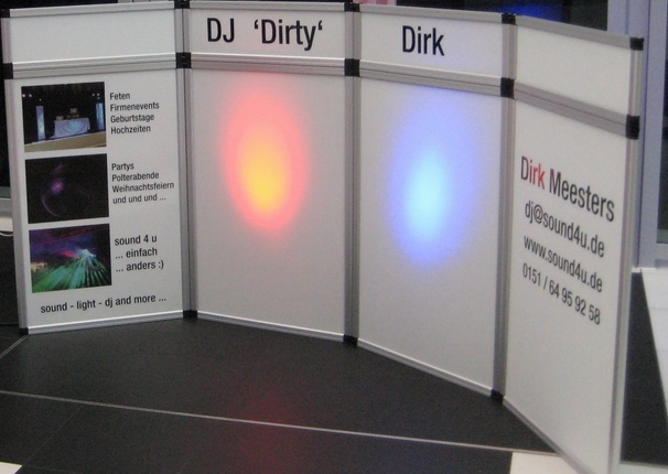 ich hab mir nu so ne messe - promotion wand bei ebay gekauft. die gibts mit holz oder kunststoff (den ich genommen hab da man hier hintergrundbeleuchtung sehen kann). kann man beliebig aufbauen. eine panele ist ca. 60 x 90, bzw. 30 x 90. anbei mal mein beispiel von ner hochzeitsmesse. hab mir noch durchsichtige aufkleber (im bild links) bedrucken lassen, fertig.