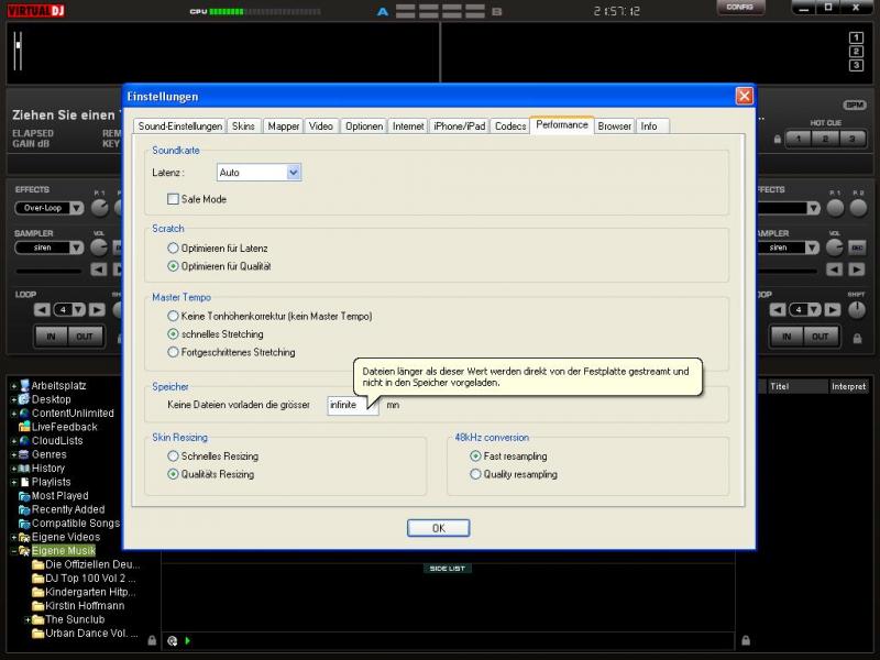 Bei infinite wird der Track geladen solange auch RAM Speicher vorhanden ist. Ein 1 Stunden MP3 kann schnell den gesamten RAM Speicher nutzen, dann wird wieder On-The-Fly nachgeladen. Ins RAM wird eine MP3 Datei entkomprimiert und als Wav geladen, somit kann eine Datei 12 Mal grösser sein und Speicher brauchen, je nach MP3 Qualität.