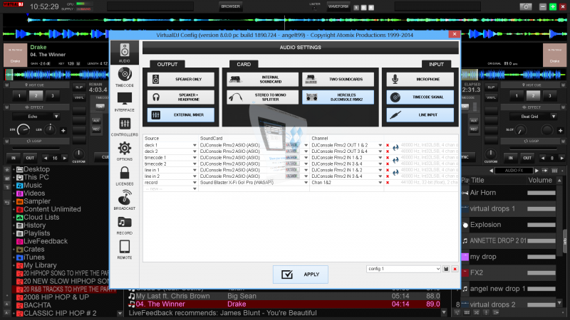 For example, source> deck 1> soundCard> hercules rmx2(asio)> Channel> Out 1 L&R (don't know how the channels are named on the rmx 2).