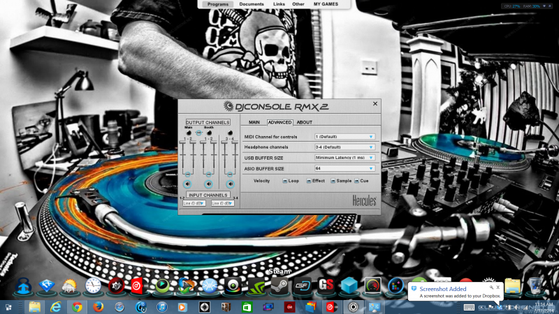 Then with virtual dj application closed, open the hercules control panel(the vinyl icon on the taskbar), it is set by default in wdm mode, switch it to asio mode, once done you can see that now there are settings for the samplerate, the bit depth and the asio buffer.