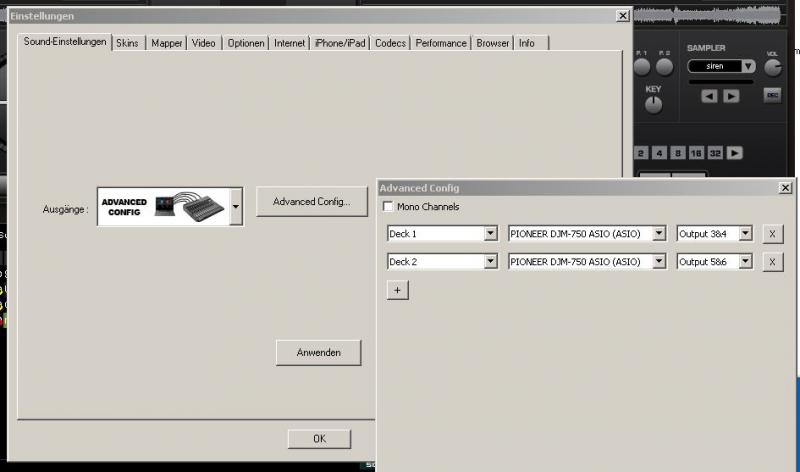 das sonderbare ist aber: wenn ich bei der config einen extrene 3 kanal mixer auswähle dann gibts keine probleme mit dem sound. die zwei controler und auf dem dritten den sampler funktioniert. warum klappt das nicht mit der adv. config?