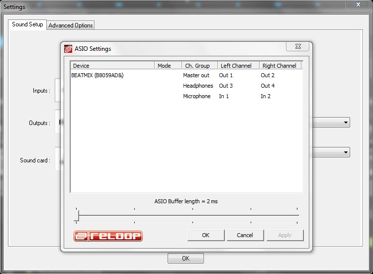 So wie ich sehe hat dein Reloop Beatmix eine interne Soundkarte,könnte sein das du es bei Output auf externen Mixer 2Channel anstatt Headphone einstellen musst,sowie unter Soundcard anstatt deinen Asiotreiber ,dann deinen Reloop Beatmix falls er dort auch zur Auswahl erscheint