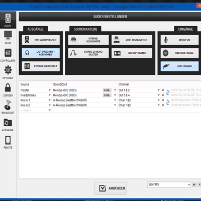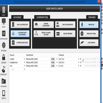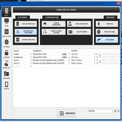 der beatmixer hat eine auch eine integrierte soundkarte das Problem is bei der kostenloßen test version geht es komischer weise aber da is die einstelung anders
