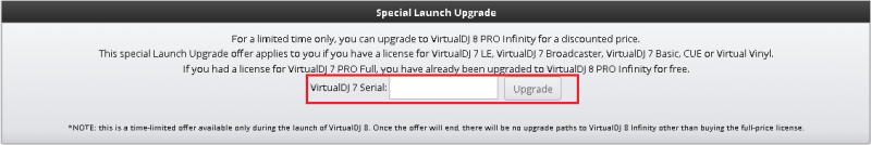 Spezielles Upgrade-Start Angebot, bei Special Launch Upgrade deine VirtualDJ 7 * Serial Nummer eingeben. (Etwas runterscrollen)