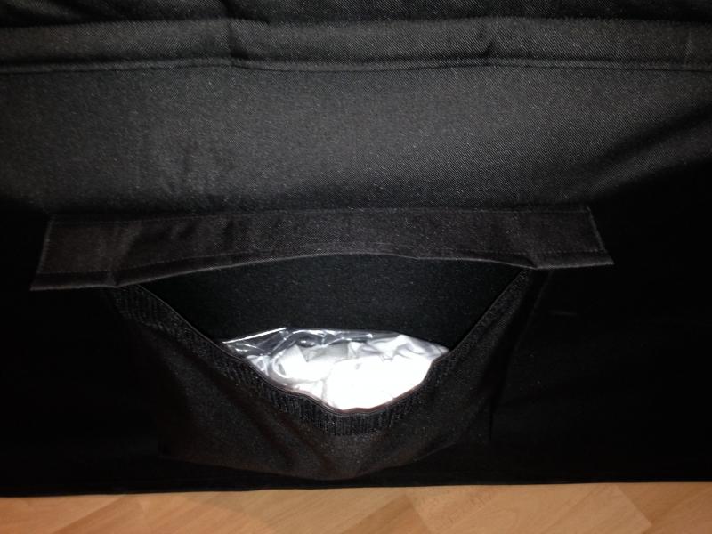 An der Vorderseite ist eine kleinere Tasche aufgenäht in der sich die Spanntücher befinden - auch hier eine Klappe mit Klettverschluss.