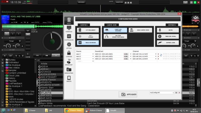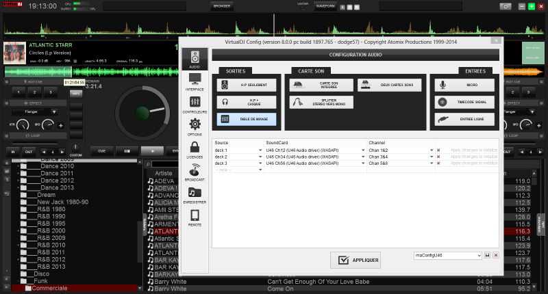 Je peux pas te le montrer car je suis pas avec mon matos mais il y a effectivement un soucis dans la reconnaissance de la carte son avec VDJ8 !