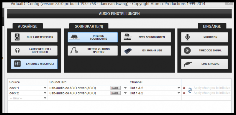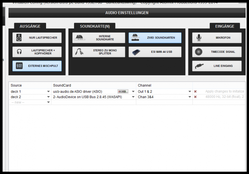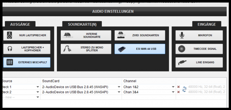 Wenn nicht, kannst du dann im unteren Bereich der Soundkonfig von Hand 2 Decks Einstellen, als Soundkarte dann die Maya und dann die Ausgänge einstellen?