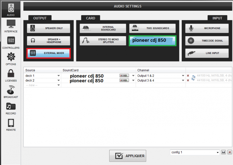 2-si l'onglet "Pioneer" (entouré en vert) est présent dans "card", il vous suffit de cliquer dessus et VirtualDj configurera automatiquement les cartes son des deck 1 & 2.