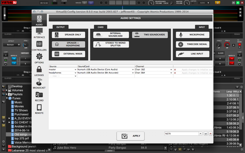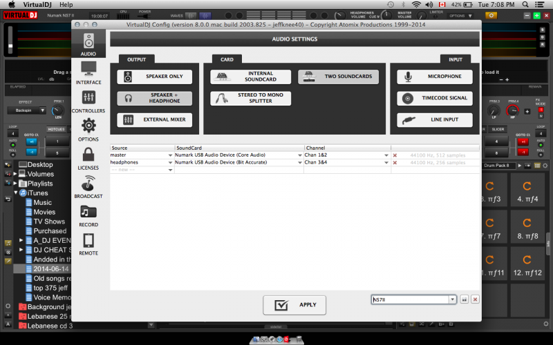 If you have, then the Numark NS7II should offer a special button in the Audio tab with the pre-defined audio configuration.