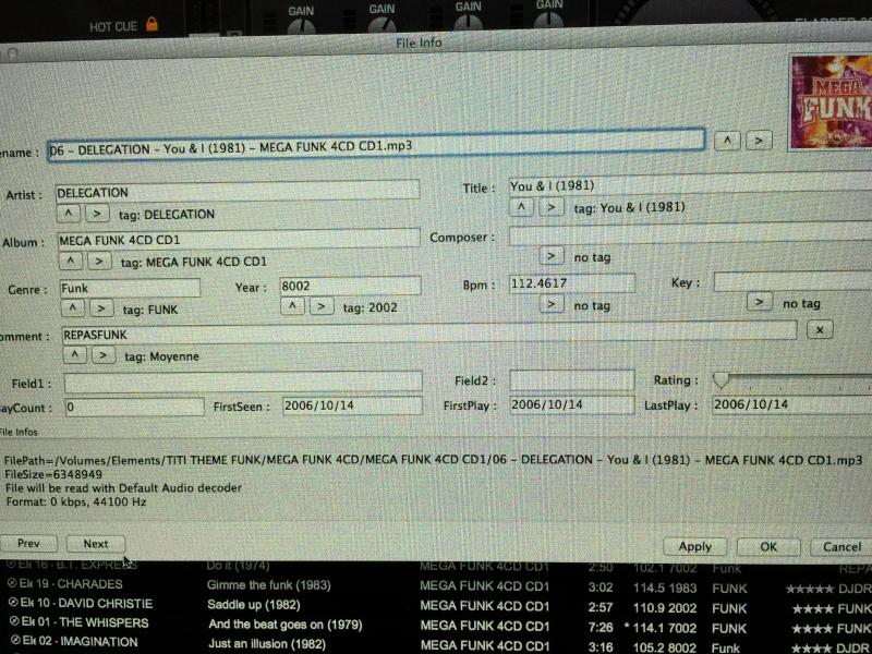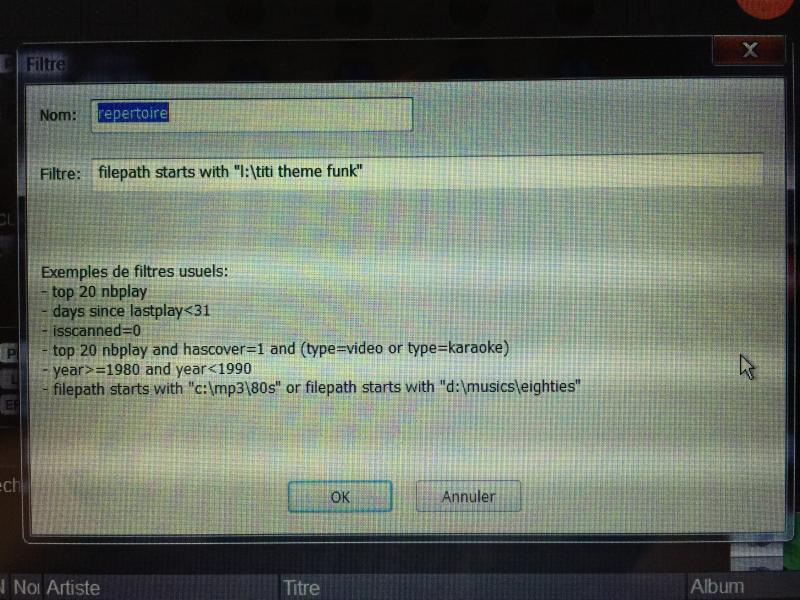 Je voudrais faire une requête filtrée (icône bleue dans vdj7) avoir par exemple tous les mp3 du répertoire "titi theme funk" sur mon MAC et ça ne marche pas. je suppose que ma syntaxe n'est pas bonne alors que sous windows ça fonctionne. Quelqu'un pourrait il m'aider svp???