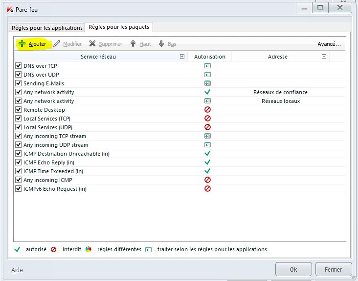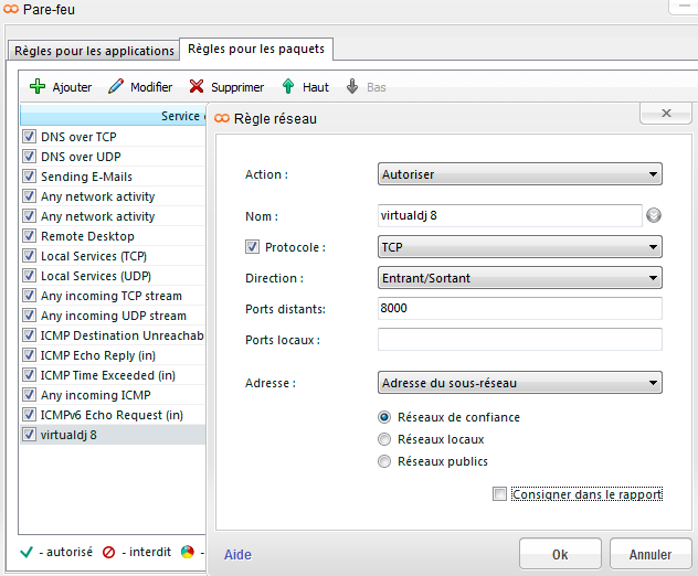 Merci pour cette réponse pertinente. L'autorisation est déjà donnée à VirtualDJ. On m'a dit d'ajouter une règle de paquets de donnée, mais après avoir cliquer sur ''Ajouter'', je m'y perds comme ce n'est pas permis. Ci-bas les captures d'écran. Si toi ou quelqu'un d'autre si connait, qu'il parle ou se taise à jamais! :P ;)