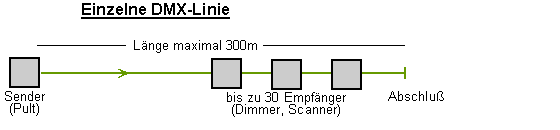 Bei DMX-Steuerung werden alle Lichter bzw. Effektgeräte, vom Lichtmixer wegwärts an ein "Datenkabel" angereiht und somit zentral angesteuert.