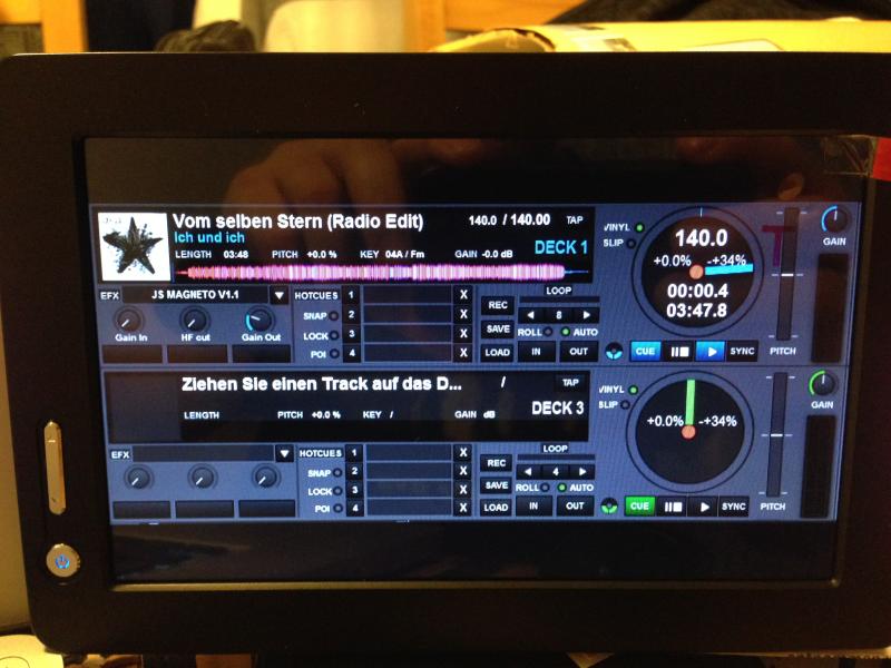 Also, ich glaube, hier wurde etwas "getrickst"... die verwendeten TFTs scheinen handelsübliche 7" bzw. 10,4" TFTs zu sein, wobei jeder einzelne mit einem entsprechenden Videosignal gespeist wird (läßt sich über eine Grafikkarte mit mindestens 3 separaten Videoausgängen realisieren)... aber was mich nachdenklich stimmt ist die Tatsache, daß dort der Inhalt von zwei Playern sowie einem Browserfenster angezeigt wird... ich lehne mich mal soweit aus dem Fenster und sage, es handelt sich nicht um TouchDisplays wie bei der neuen Generation von Controllern (siehe Numark NS7III o.ä.)... wenn es eine sparate Software gibt, die mindestens drei unterschiedliche Bereiche eines Fensters auf drei unterschiedlichen Monitoren ausgeben kann (in Echtzeit versteht sich!), dann wäre das die Lösung dafür... oder da hat jemand mächtig gebastelt und schon vor den anderen diese neue Technik entworfen und entsprechend umgesetzt...