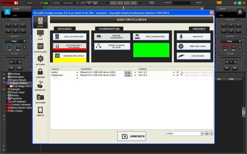 Also wie das genau beim Terminal Mix 2 einzustellen ist weiss ich leider nicht,entweder unter Soundkarten auf Master/Headphone (Rot eingezeichnet) oder versuche es mal mit Externes Mischpult (Gelb) oder wenn dein Reloop Terminal Mix 2 eine eingebaute Soundkarte hat und bei Grün abgebildet ist ,dann diese Funktion nehmen und draufklicken.