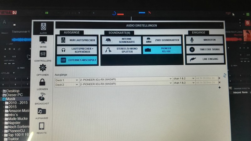 Hast du beim drop&down Menü bei ausgänge wo jetzt "2-Pioneer DDJ RX (Wasapi)" steht noch eine andere Auswahl?