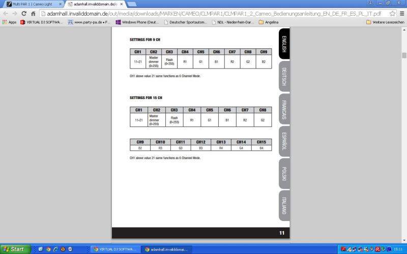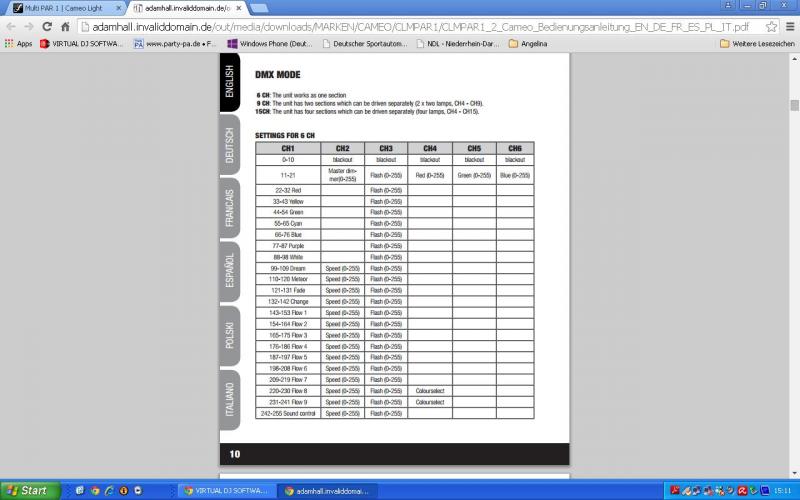 Also kannst deine Cameo im 6-9 und 15 Channel DMX Modus betreiben