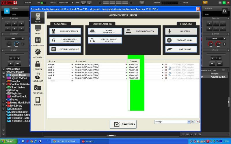 Soundeinstellung VDJ7: Advanced Config: deck1 - Realtek, deck2 - Realtek, deck3 - Realtek, deck4 - Realtek, Mic- Usb-Mic