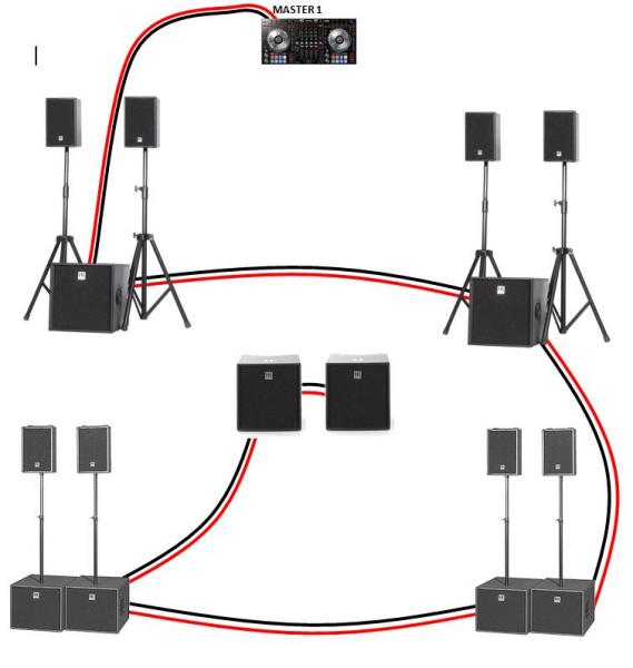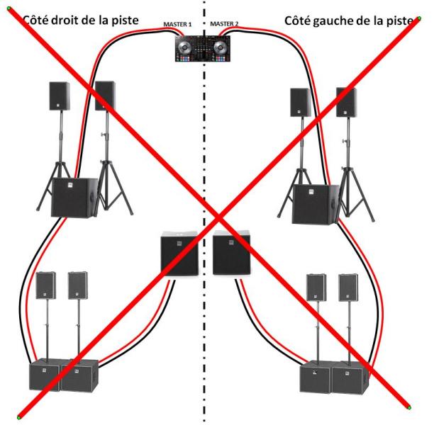 Du coup, pour n'utiliser que la Master 1 + avoir des enceintes en façade et de l'autre côté de piste + conserver la stéréo + avoir un montage pas trop complexe, il faudrait que tu fasses un branchement de ce type :