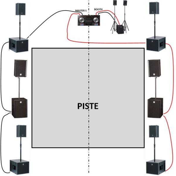 Jaimerai en fait, mettre mes 4 caisson hk helias au 4 coin de la piste cest a dire un caisson sans chaque angle avec un seul satelite sur lé caisson, puis à droite et au milieu des 2 caisson un hk Performer pareil pour le coter gauche de la piste et en retour DJ donc face à moi mon hk smart que je brancherai sur la sorti booth.