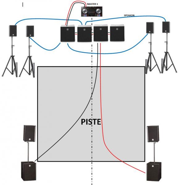 Cela impose 2 câbles XLR très longs pour aller de l'autre côté de la piste, mais si j'ai bien compris tu as déjà. Et il te faudra 4 câbles speakon suffisament long pour aller vers les 4 satellites de façade. Mais si tu reste à proximité de la sono, des 3m devraient suffire.