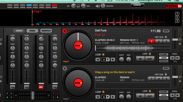 First of all, the Cue track is playing through the right main output (FOH) speakers. This shouldn't be here, it should only be in the headphones, but the cue volume knob is working correctly with this. Full left and the cue plays through the speakers (channel volume fader all the way down). The volume knob does not affect this volume, and when I turn it it won't turn in the VDJ software, although the cue knob turns in the software.