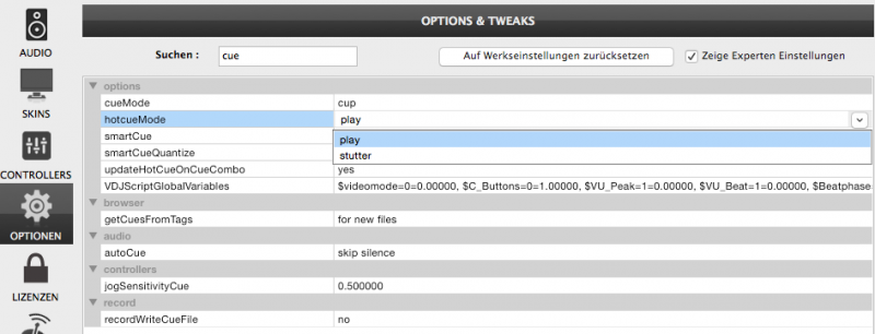 Option "hotCueMode" auf "stutter" stellen.
