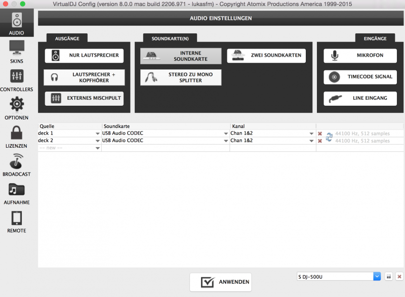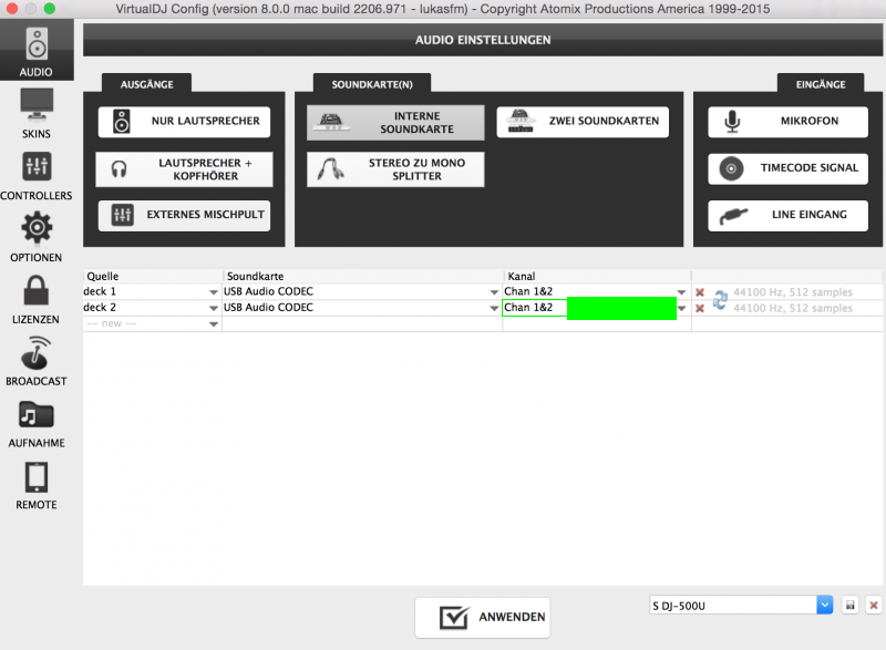 Habe jetzt das ausgewählt. Die beiden Decks kommen aber trotzdem beide auf Kanal 1 des Mischpults an!