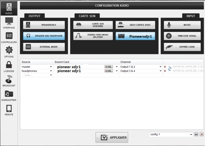 Vous êtes en mode hardware ou mode software (pc mode), normalement si je ne dit pas de bêtise vous êtes en mode pc, vous devez configurer comme sur le screen (ci dessous) (speaker and heaphone) et onglet pioneer :