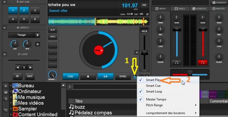 Mon problème:J'aimerais que la synchronisation ce fasent par elle même quand je pèse sur PlAY peu importe la platine et du même coup la même chose si je start le Cue d'une platine.