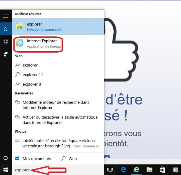 Pour cela il suffit de taper EXPLORER dans le moteur de recherche wondows 10, et apparaitra l'icone Internet Explorer et vous pouvez l'épingler