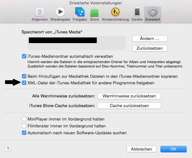 und stellt sicher, dass der Haken bei XML-Datei der Itunes-Mediathek für andere Programme freigeben gesetzt ist.