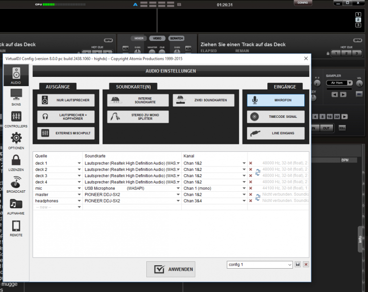 ich habe den Pioneer DDJ SX und VDJ 8 und würde gerne mit diesem Controller Broadcasten. Dies funktioniert auch. Jedoch funktioniert das Mikrofon nicht. Sprich man hört es hier lokal aber nicht im Radio, denn dort wird nur die Musik leiser. Jemand eine Idee?