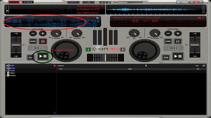 J'ai installer le logiciel Virtual DJ LE lite vendu avec. Une fois virtual dj ouvert, le contrôleur dj est bien connecté puisque du contrôleur je peux mettre une musique sur les platines. Lorsque j'appuis sur play sur le contrôleur, la musique ne se lit pas, bien qu'il y ait marqué play sur le logiciel.