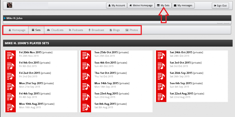 schaut auch die dort befindlichen Buttons [Homepage] - [Sets] - [Cloudlists] - [Podcast] - [Broadcast] - [Blog] - [Photos] an.